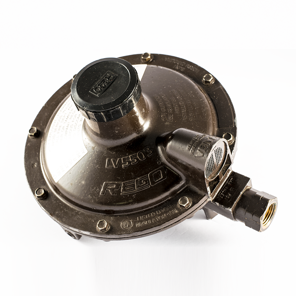 Regulador REGO LV5503B6 de baja presión y segunda etapa, para tambos de 100 lb y tanques estacionarios, con salida ajustable de 9” a 13” w.c. y capacidad de 1,600,000 BTU/hora.